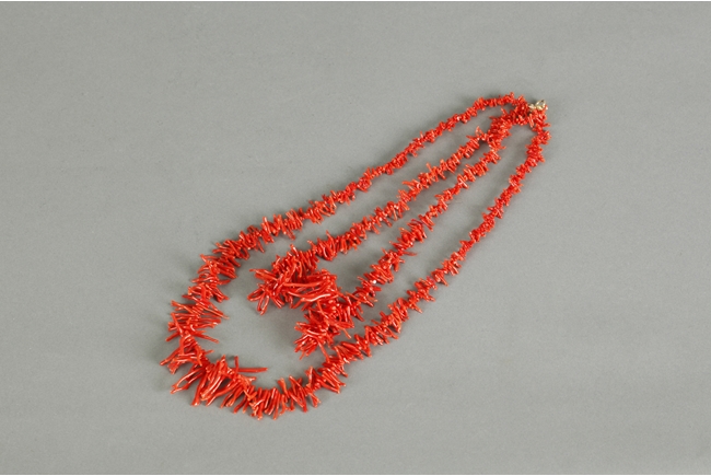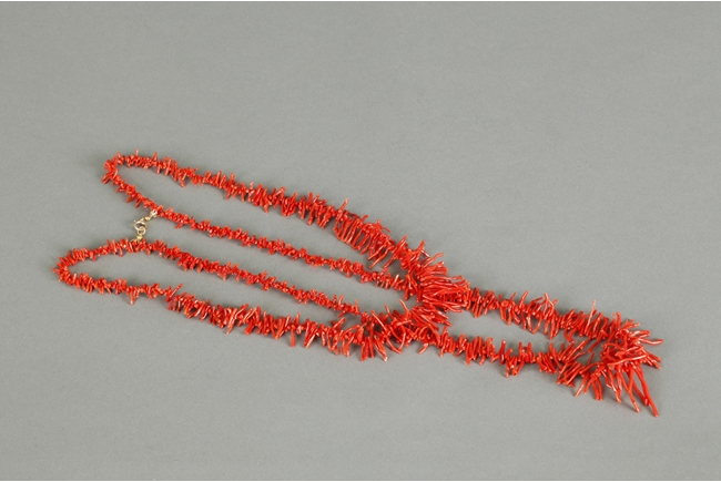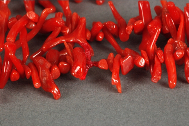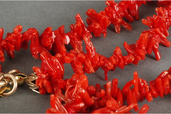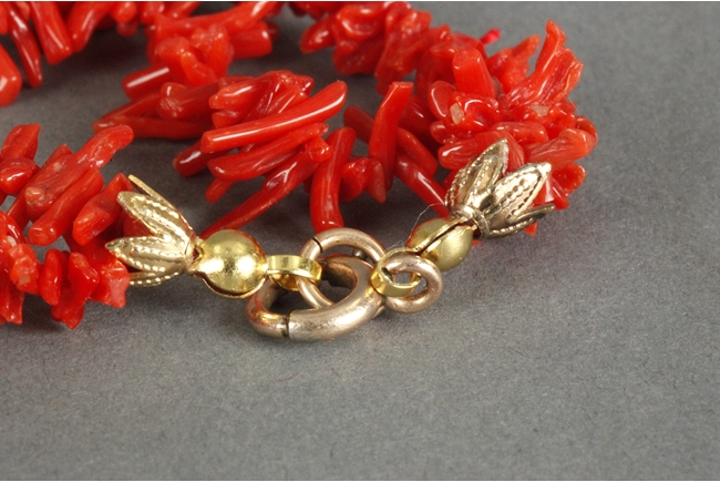 The coral necklace has two layers and is stranded with branch shaped coral, ranging from short to long.