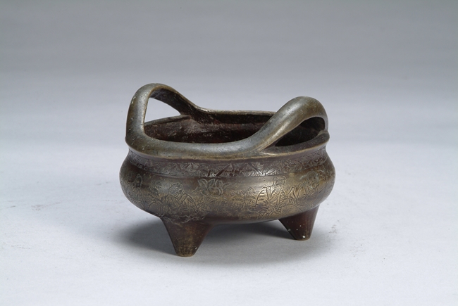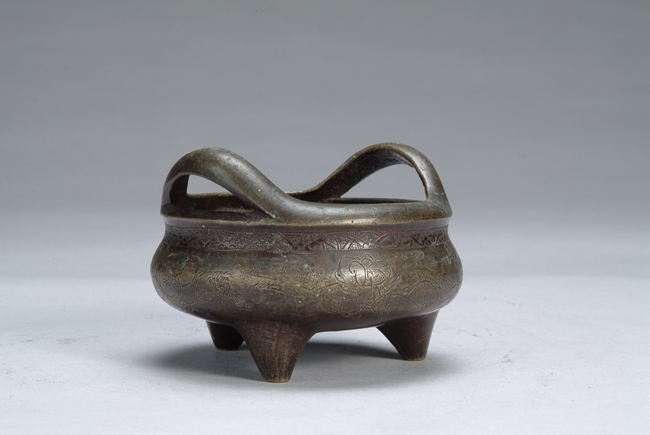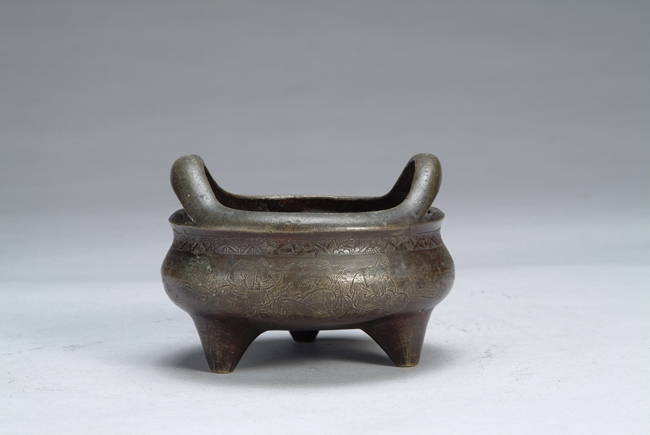 A Chinese bronze tripod censer with two upward handles, eight people carved on the side of censer, mark of "XUANDE".