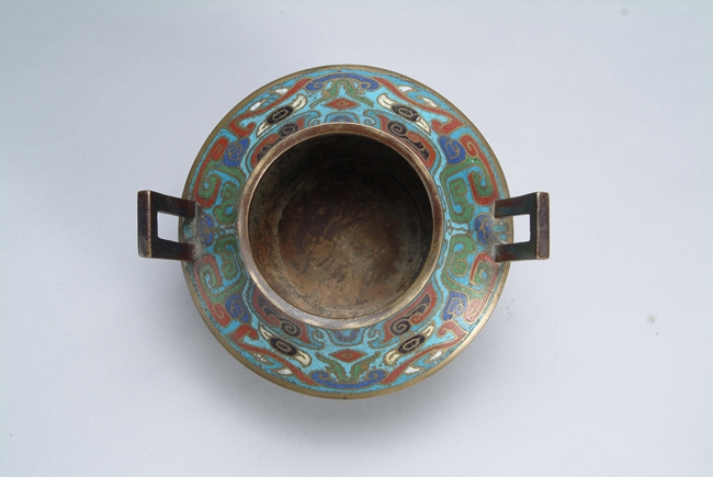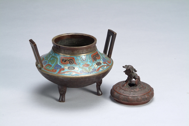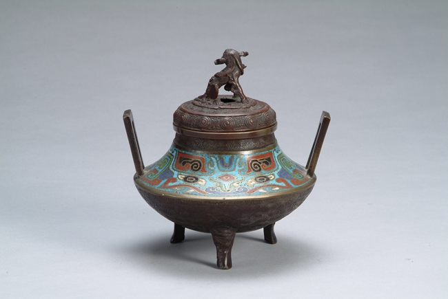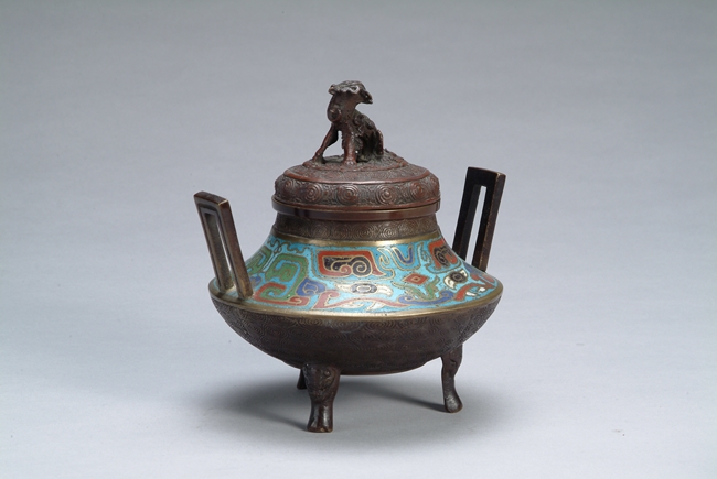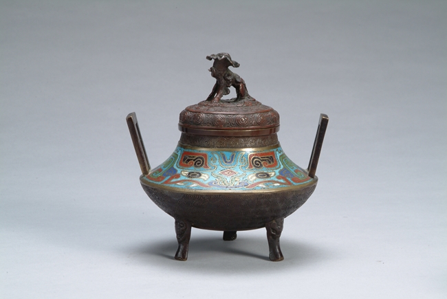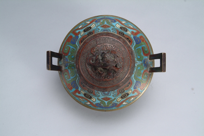 A mythical beast is situated on the lid, turning his head; two long and tall handles; beautiful patterns on the body.