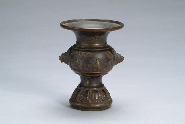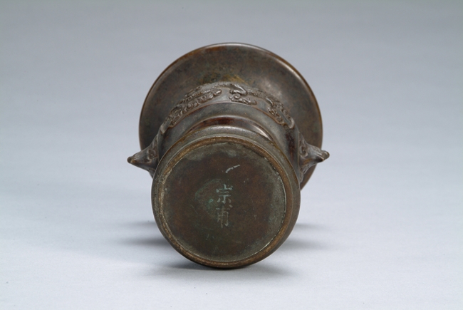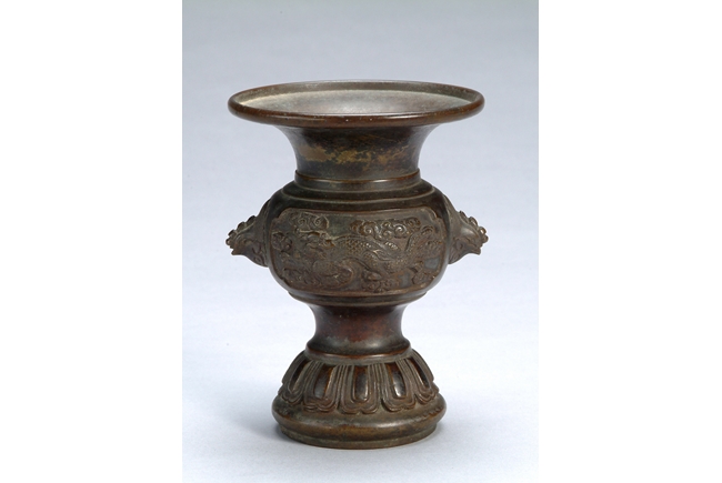 A Chinese bronze vase with large opening mouth stretched from an ovoid body, handles carved in the form of a phoenix with dragon patterns present on exterior; artist mark on side.