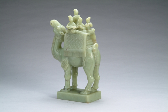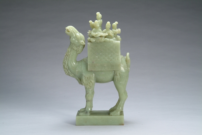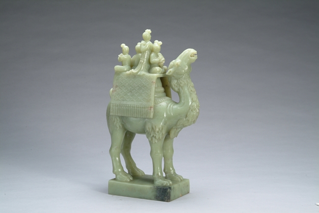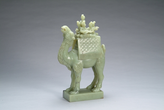 A CHINESE CARVED JADE CAMEL FIGURE    玉雕樂女駱駝