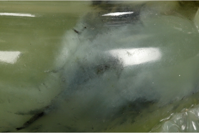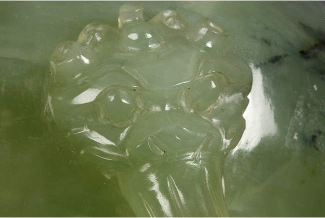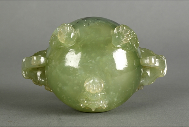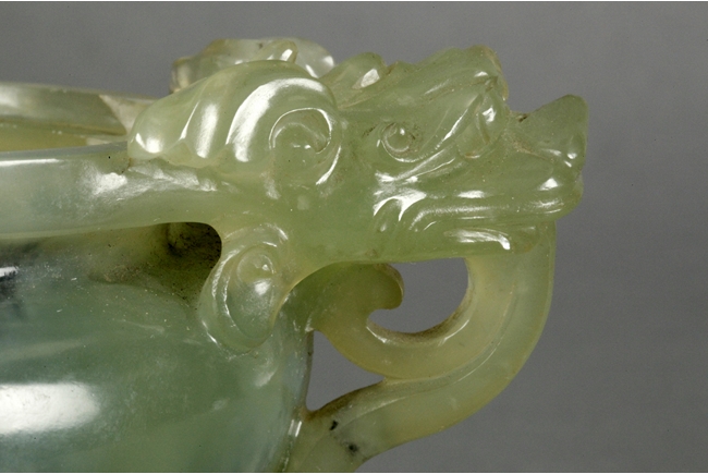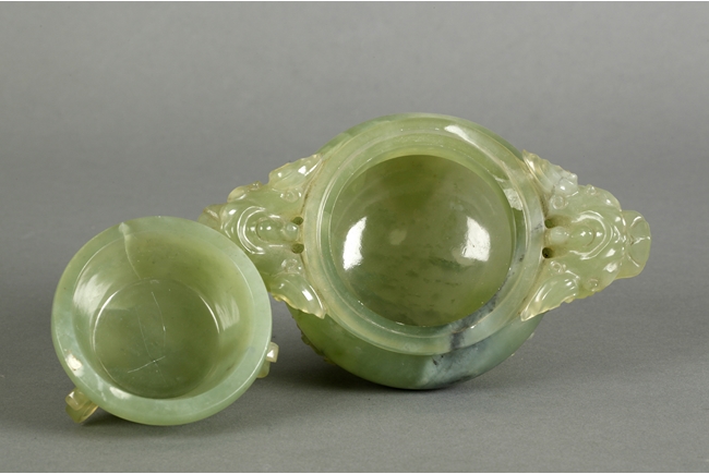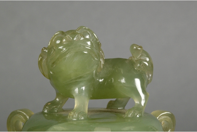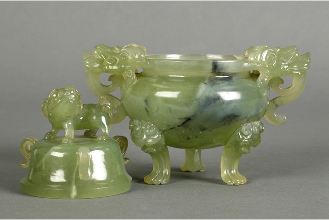 A jade censer with three beast mask legs, green body with a patch of suffused black and light blue, a finely carved mythical beast rests on top of the lid, two Chilong handles on the side.