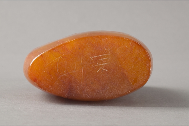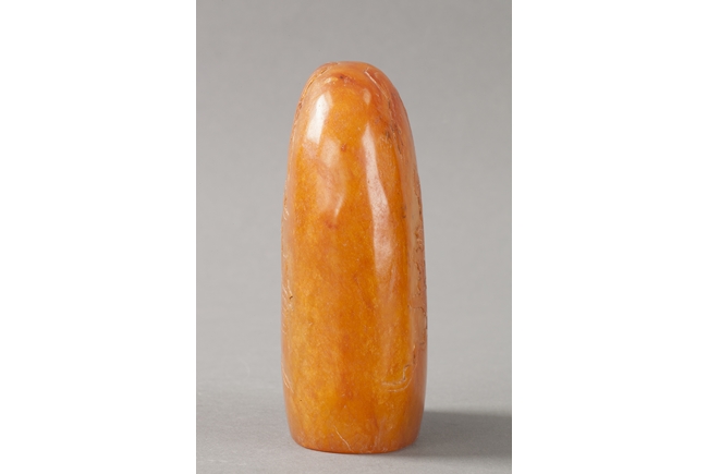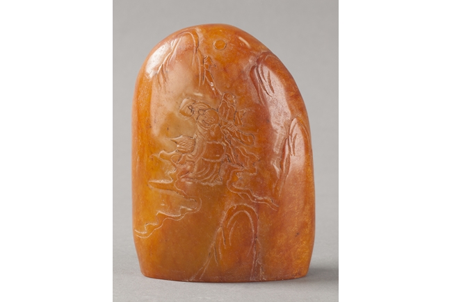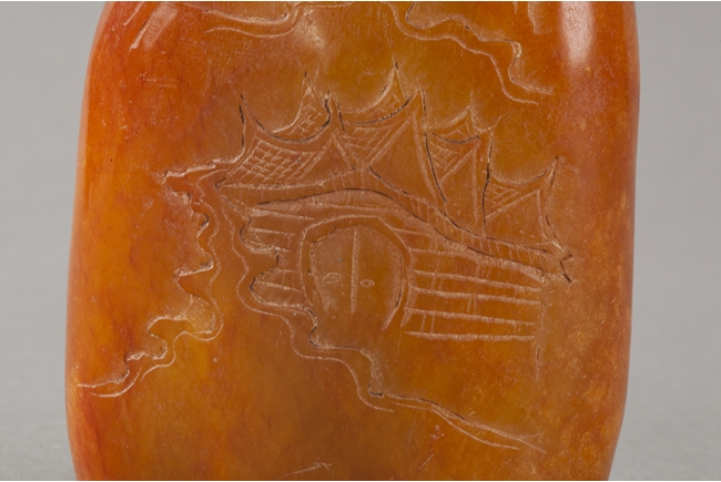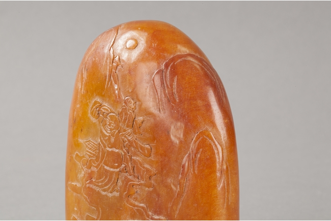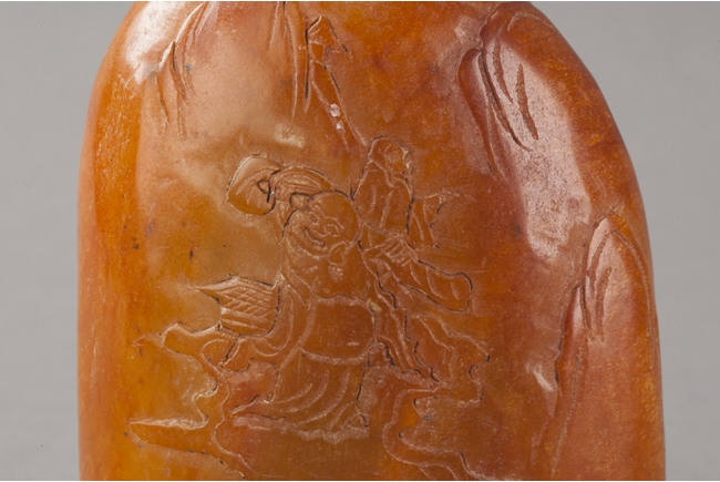 A Shoushan stone seal with figure of a Buddha flying over clouds on one side and a temple on another side.