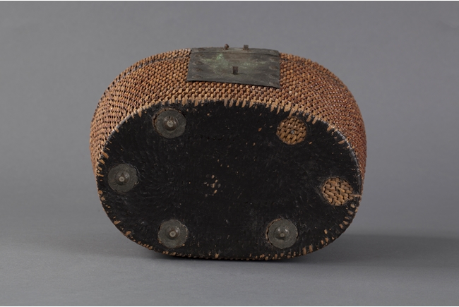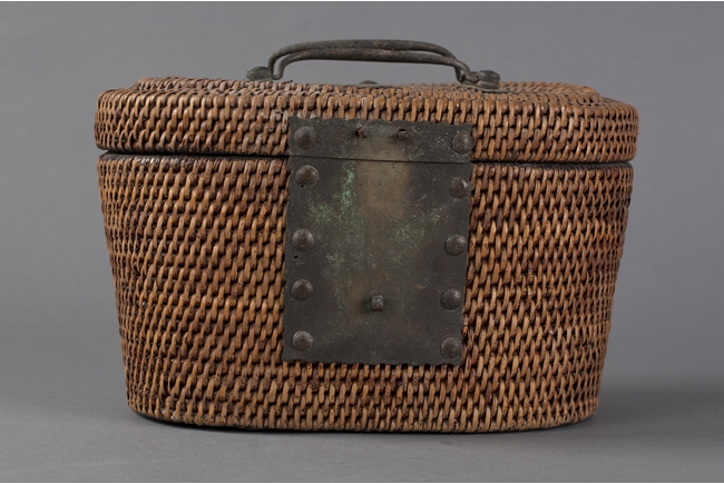 This well woven basket has two metal handles on top and metal plates on the side for locking purposes. The basket is shaped like an oval and is slightly wider on top compared to the bottom.