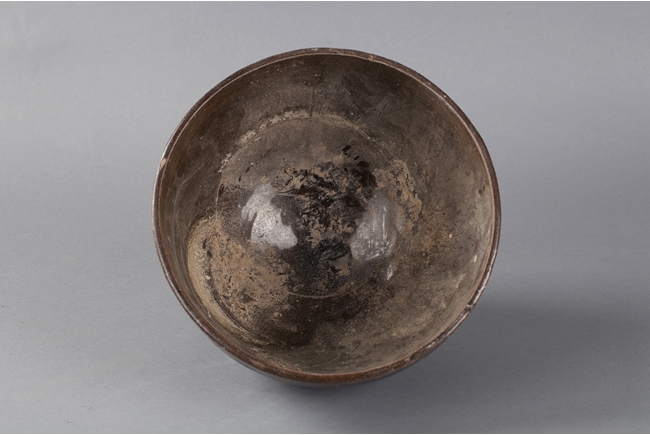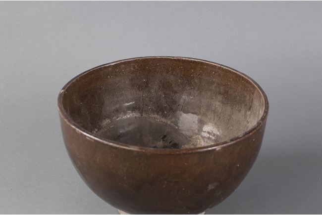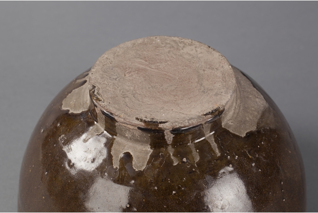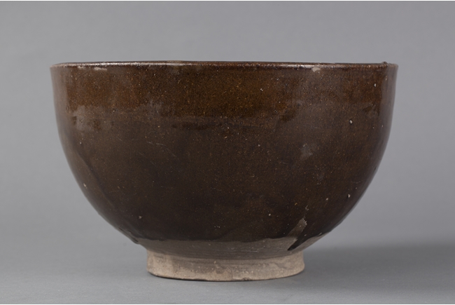 This large glazed ceramic bowl is chocolate-brown in color and is unglazed on the bottom. The bowl has a slightly taller body than average.
