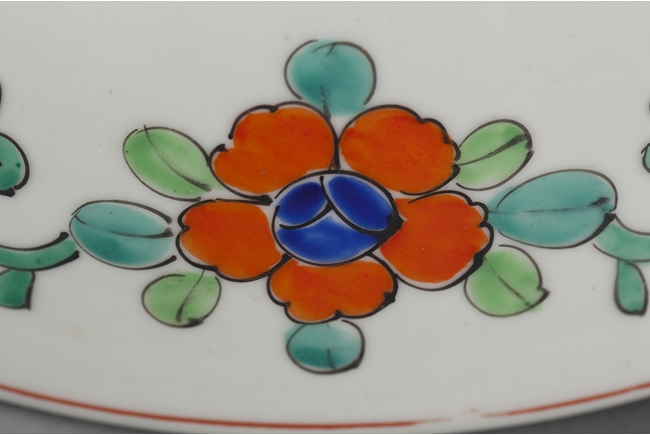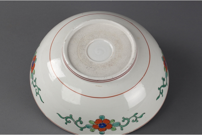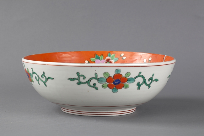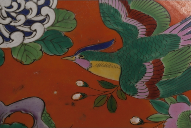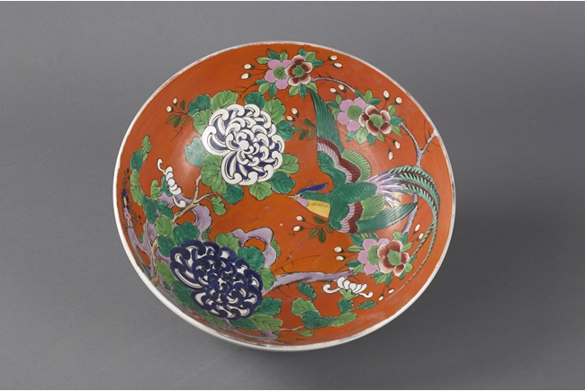 This bowl is painted with images of birds and flowers within the inside. The background is rich with an orange hue. The outside is decorated with a repeating floral pattern.