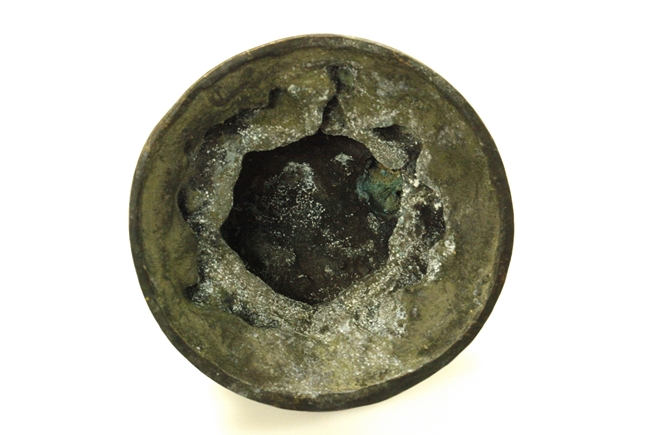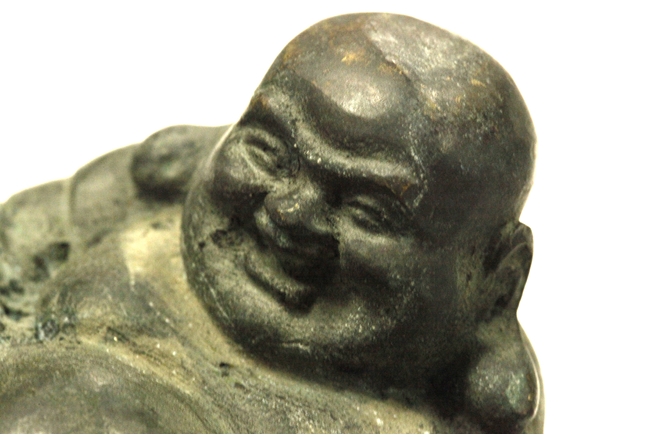 A bronze Budai Buddha is sitting on a stack of Chinese coins and Yuanbao, laughing as he holds a Yuanbao in hand.