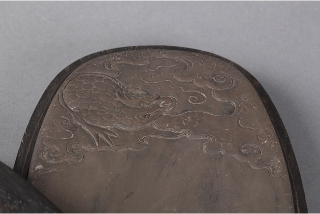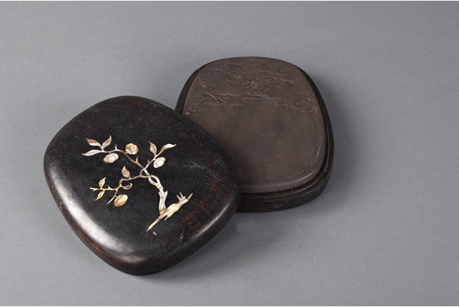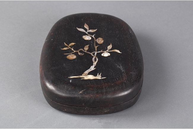 Of tapered ovoid shaped outline with rounded corners, the top carved with a dragon amid swirling clouds. A persimmon tree featured on the outside case, made from abalone shells.
