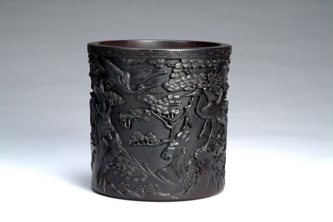 A CHINESE ZITAN WOOD "CRANES" BRUSH POT    紫檀木雕筆筒