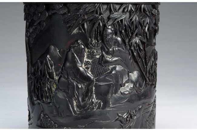 Features intricately carved two elders playing Go in the bamboo garden, and two cranes in the forest.