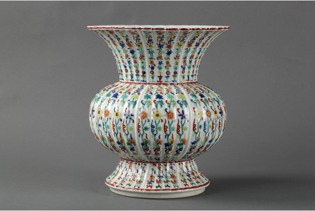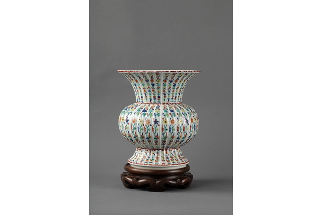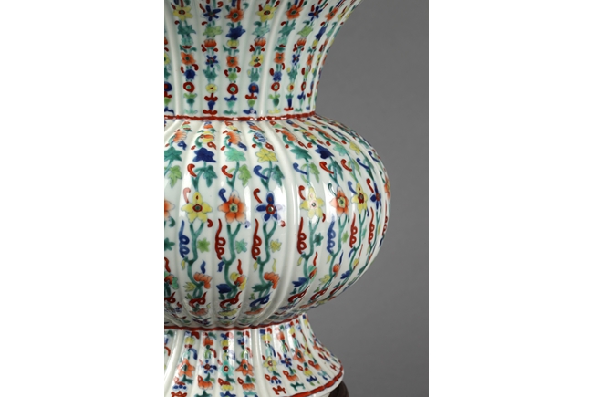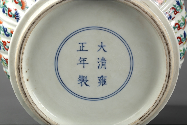 The vase has a splayed ring foot, bulbous body, waisted neck, and everted rim, similar to flower petal shape. The vase is covered with flowers and vine patterns. Bottom bears six character "DAQING YONGZHENG" mark.