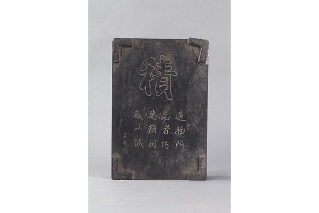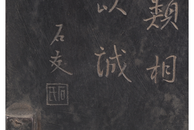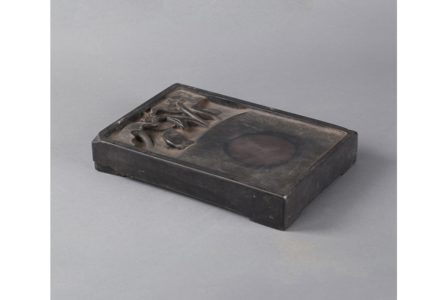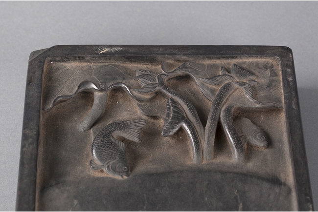 The inkstone is carved on top with two carps swimming in river, with lotus flowers and leaves. The bottom inscribed with Chinese characters, with artist signature and seal.