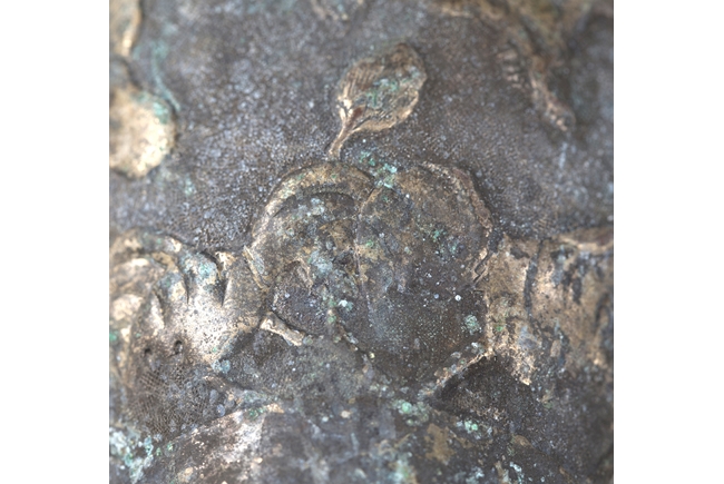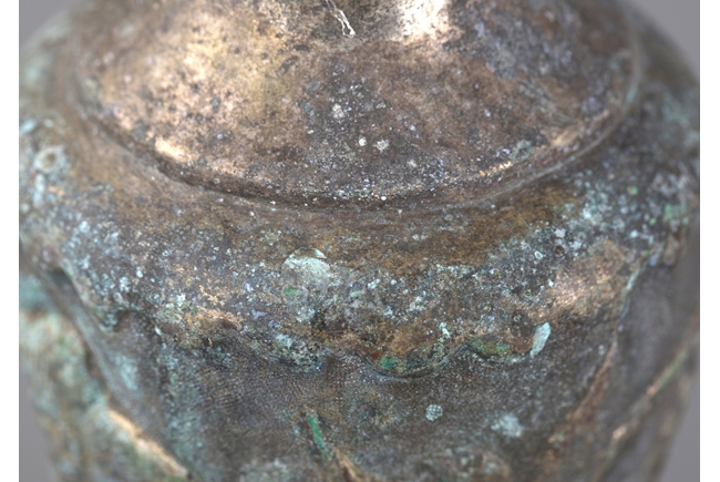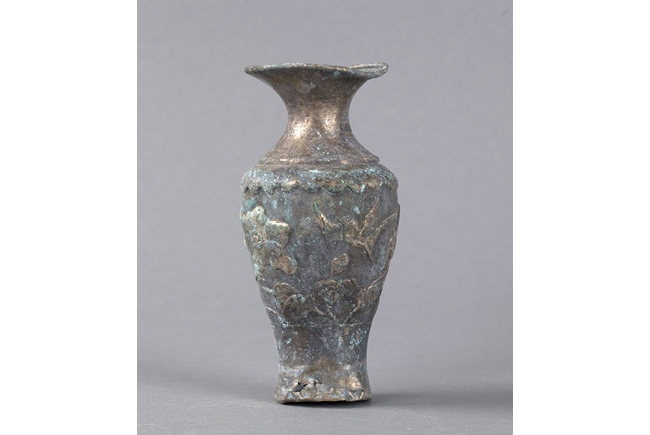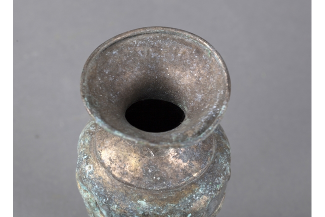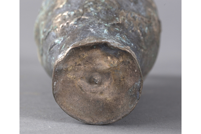 This ancient bronze vase is carved with images of flowers and mythical beasts around the body, the mouth of the case is leveled differently around, and the base is mostly flat.