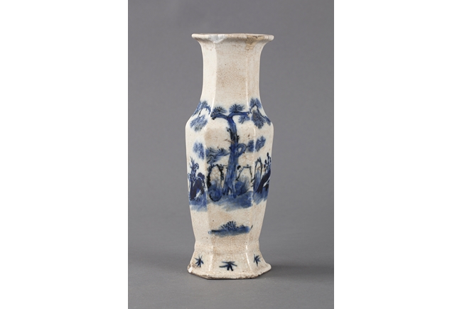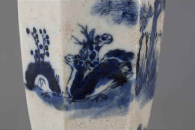 This blue and white ceramics vase is painted with a scene of a forest all around. The vase is a hexagonal shape with the mouth and the base being equal in size.