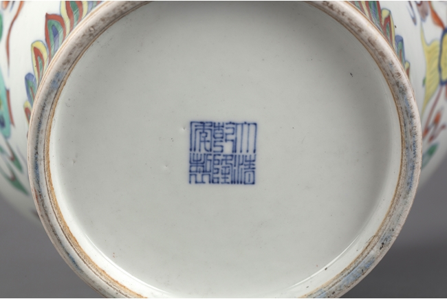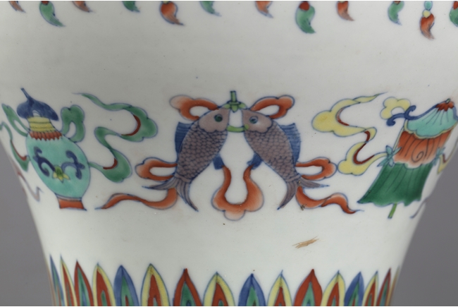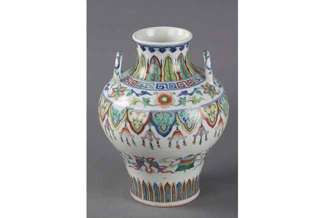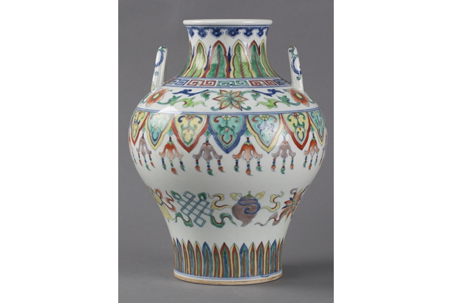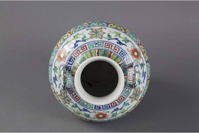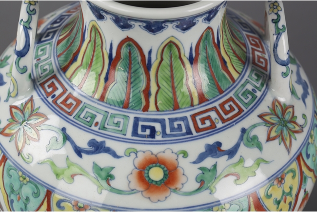 A Doucai porcelain vases with globular body, flower patterns, eight Buddhism treasure patterns, key-fret patterns, and leave patterns. Two ring handles on the body, pointing straight up. The bottom bears a six character "QIANLONG" mark.