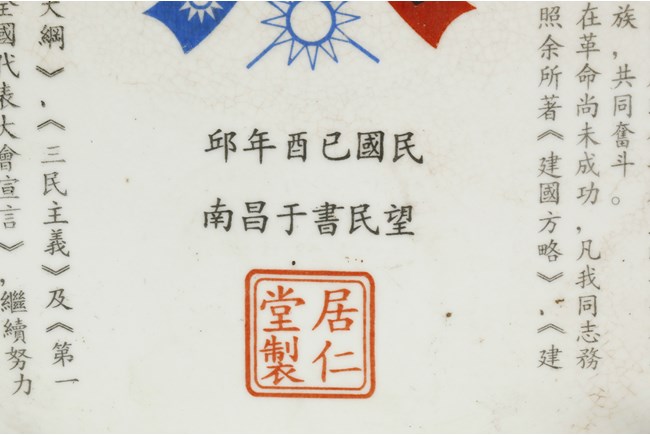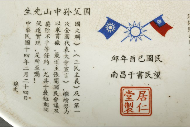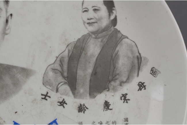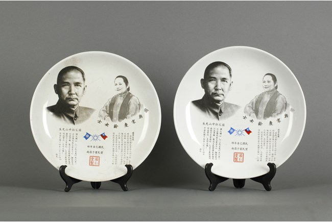 A pair of porcelain plates honoring SUN YAT-SEN and his wife. One plate is of normal styling, while the other plate is of crackled styling. Artist seal on the front.