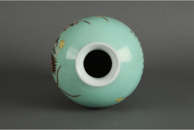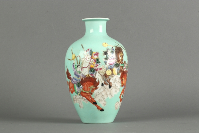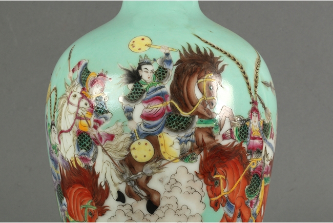A vase of ovoid shaped body with a flared rim, well painted with generals going against each other amid floating clouds. Chinese calligraphy and artist seals on the side, and the bottom bears a six character "QIANLONG" mark.