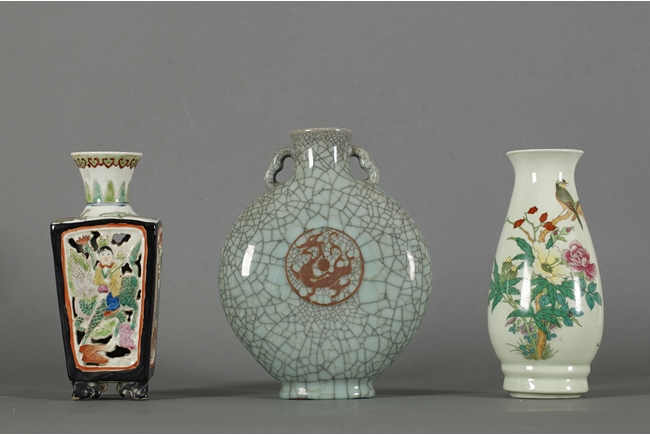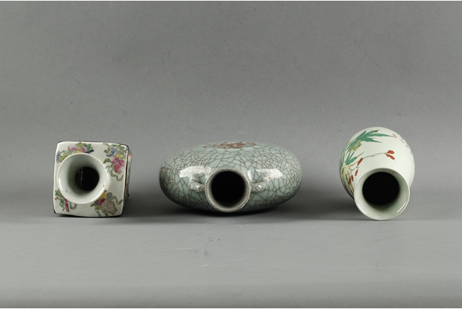Three porcelain made vases. Each depicting a different theme and shape. The first one, painted with flowers and a pair of birds resting on top, with artist seal on the bottom; the second, covered overall in a thick pale celadon glaze with dark crackle in imitation of Song dynasty; and the third, painted with fairies each riding a different mythical creature, artist seal on the bottom.