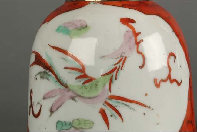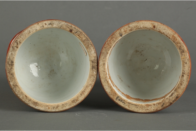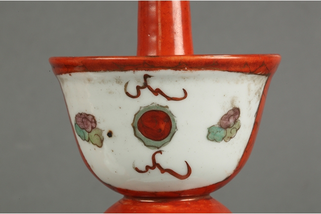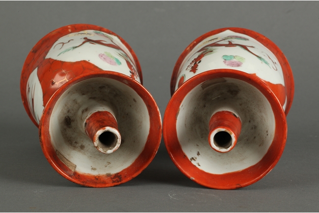 Each candle holders has red ground and two panels, one depicting a dragon and another depicting a phoenix; top part has two panels of the sun and clouds; shaped like a small cup on top of a bell.