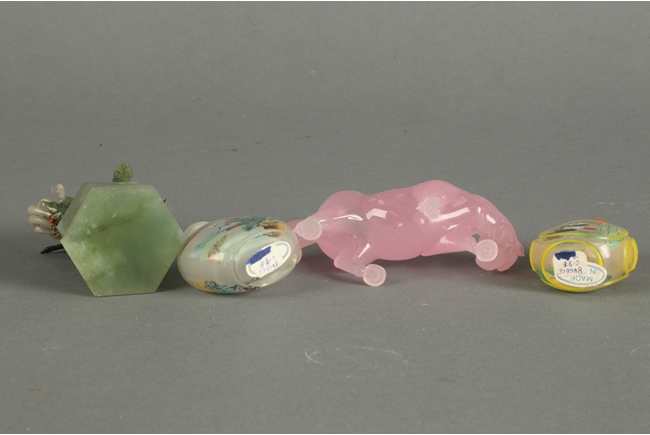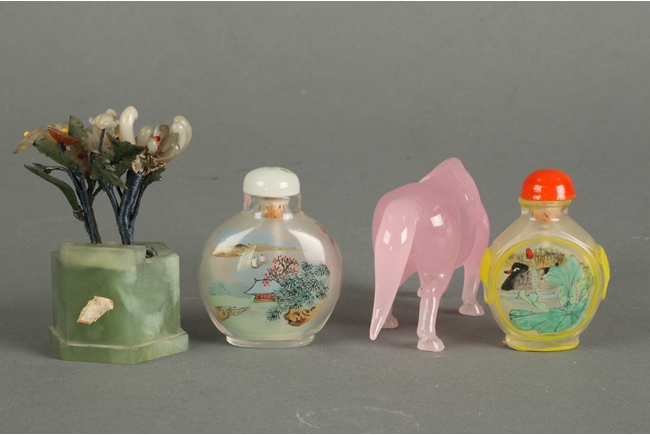 Two well made glass snuff bottles with slight transparency, one of rounded pear shape, finely painted with a panda surrounded by bamboos along with a pond scene on the other side, depicting a lone duck and lotus. The second snuff bottle features a lake scene and delicate flowers with a butterfly floating above. One ornament depicts a horse made of rose quartz, and other ornament is a very detailed jade along with two flowers made of the same material depicting a flower vase.