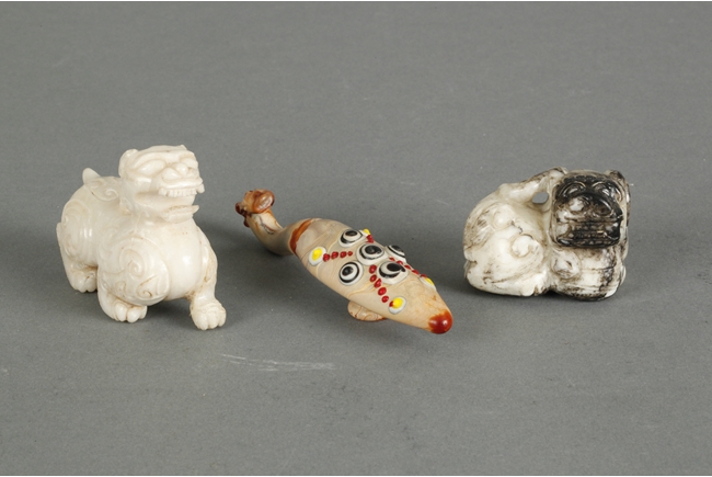 Two Chinese carved jade lion ornaments and a Chinese seahorse ornament