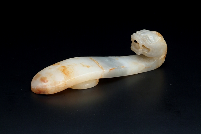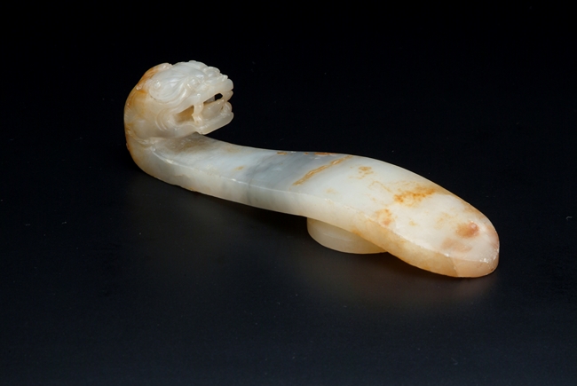 A CHINESE CARVED JADE "DRAGON" HEAD HOOK 玉雕螭龍帶鉤