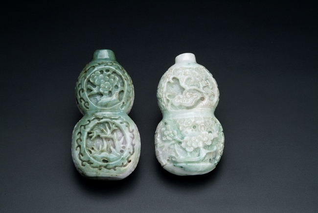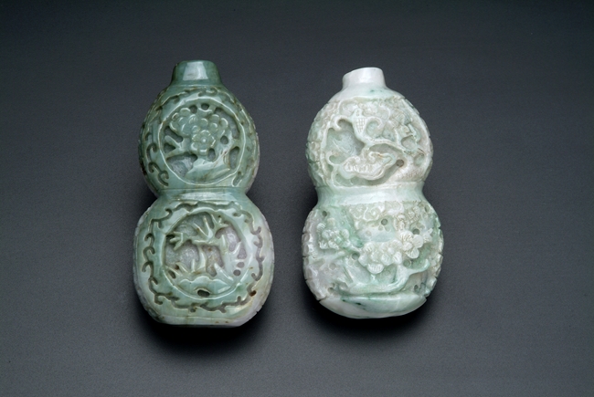 Both gourd shaped jade has carvings of flowers, trees, and other patterns.