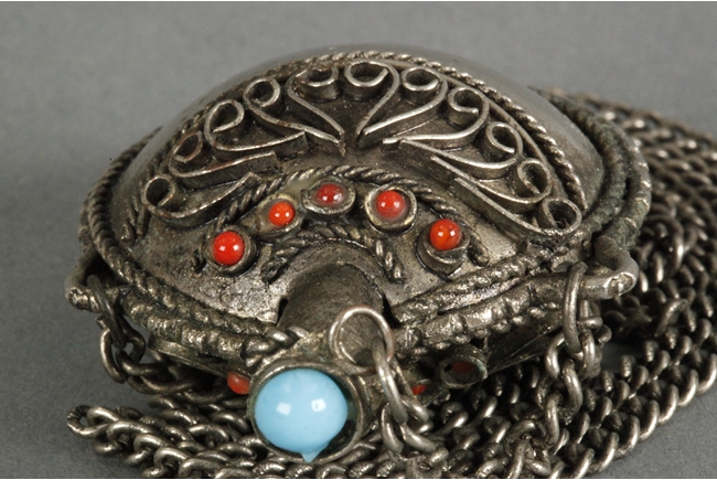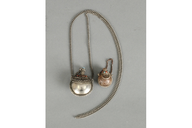 Delicately carved silver snuff bottles, both with a few turquoise and coral, and silver chains.