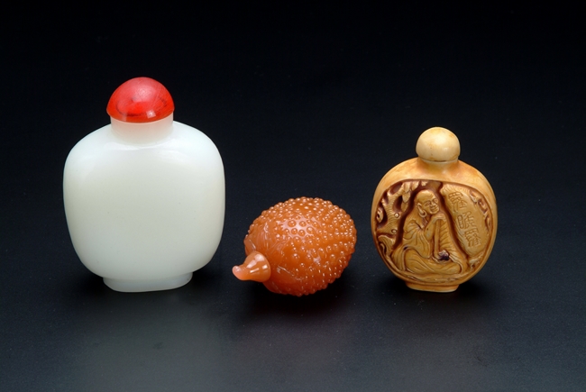 The first is of flattened form, with a flat lip and recessed foot surrounded by a footrim,the stone of soft white color with a a hint of ivory. The second is of a round cylindrical form, carved overall with an intricate basketweave pattern in the orange hue stone. The thrid is crisply carved in relief with a scene depicting two elders sitting down on both sides of the bottle.