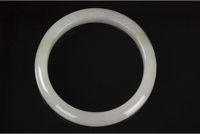 The smooth bangle is of a white color suffused with hints of tinted green and magenta.