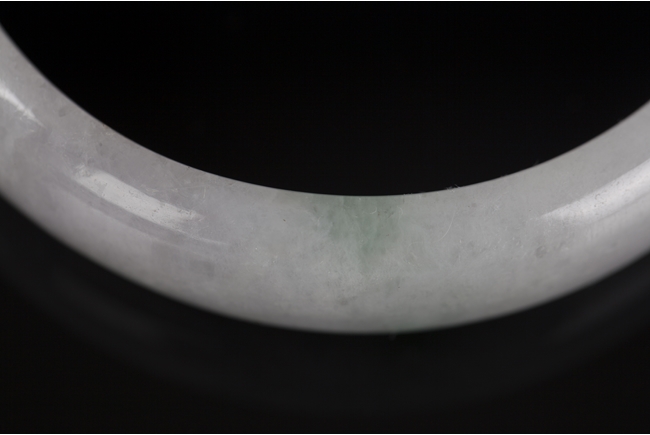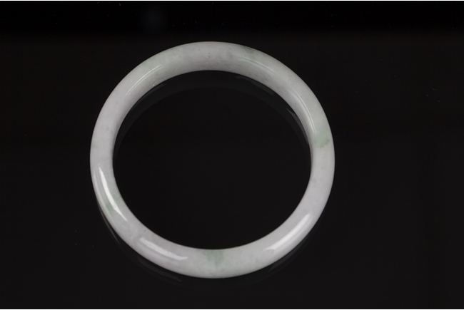 The jade bangle is mostly white and translucent in color, with a few patches of emerald green.