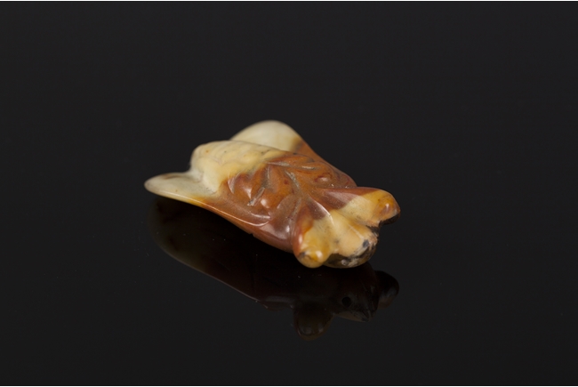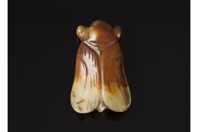 The chicken bone jade carved cicada ornament has its wings closed. Natural brown patches of color is present.