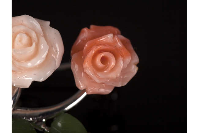 This beautiful floral clip uses white gold, jadeite, and coral to depict branches of roses. One rose is angelskin color while the other is salmon.