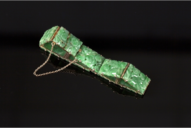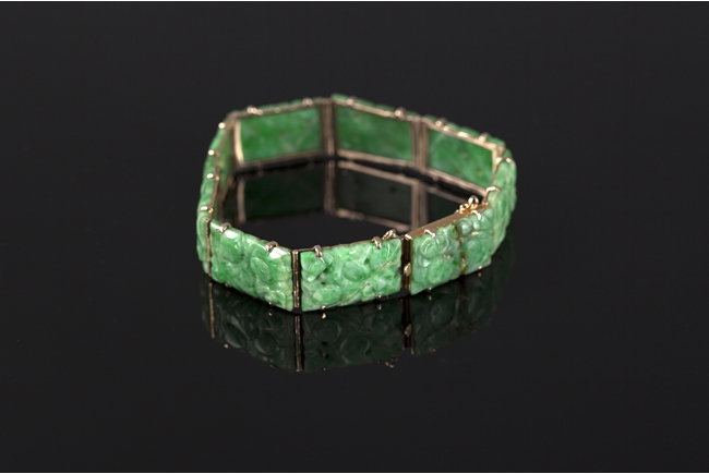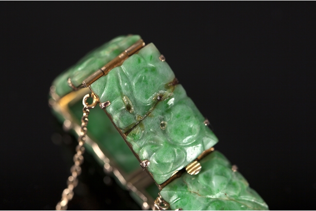 This beautiful lush-green jadeite bracelet is inlaid with 14K yellow gold on the edges and the back. The jadeite has carvings of peaches and leaves.