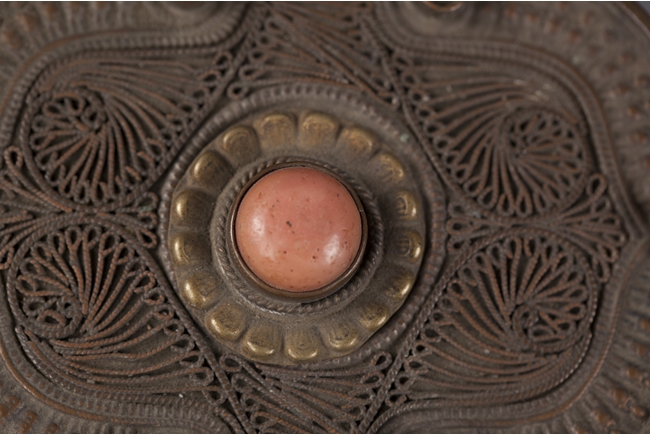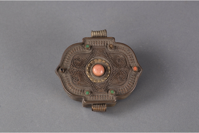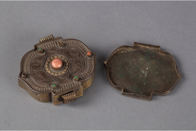 The lidded silver box has coral on the very top, along with intricately woven silver linings. Opens to a small container inside.