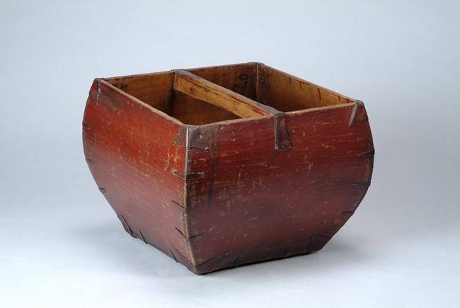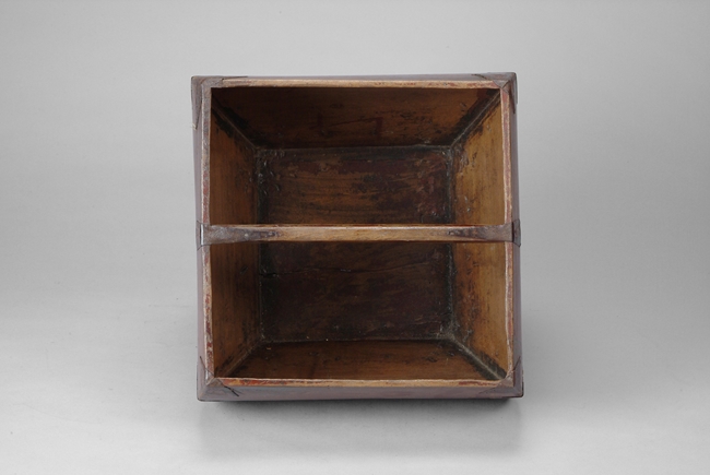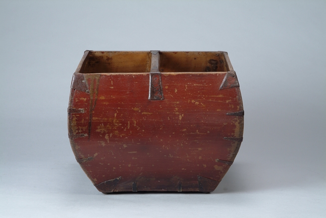 The rice bucket features a large square opening with a handle bar in the center; iron strips reinforced the corners and edges; has cracks.