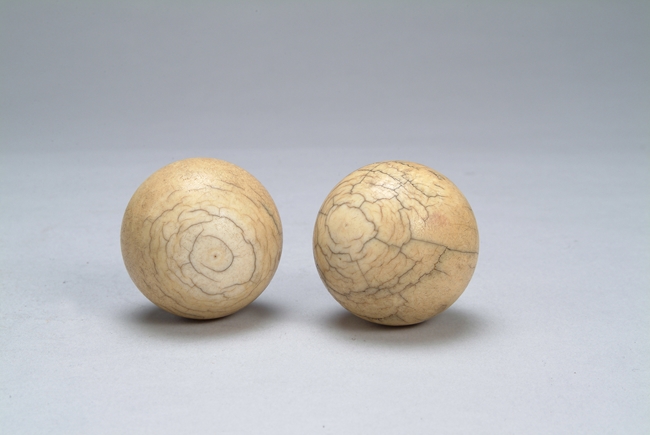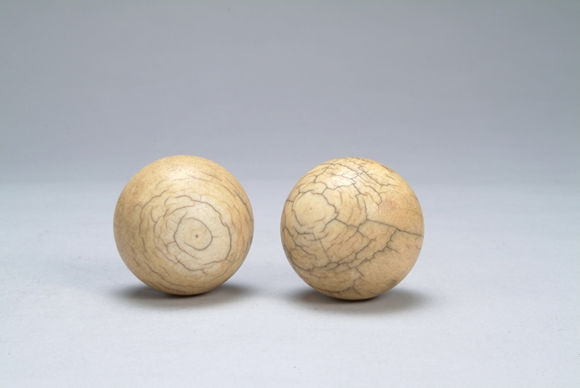 The ivory balls are uniformly sized and in perfectly round shape; visible cracks.