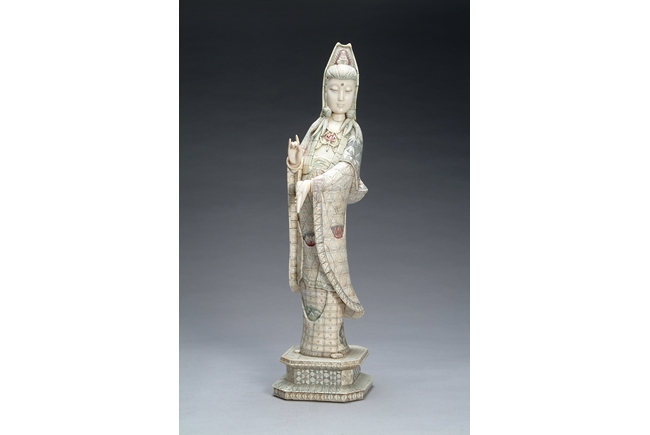 The Guan Yin's face, hands, and the vase are made of ivory; multiple colors used on the bone figure.