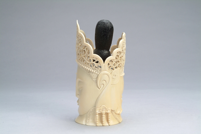 The statues features a Buddha's head with elaborate headdress carving, long earlobes, and closed eyes.