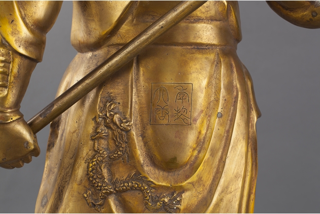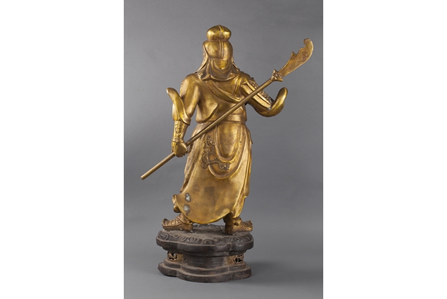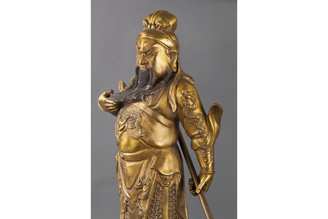 This Guanyu figure has one hand caressing his beard while the other hand grasps his signature halberd firmly behind him. The figure is well-carved and the armor is decorated with many dragons.