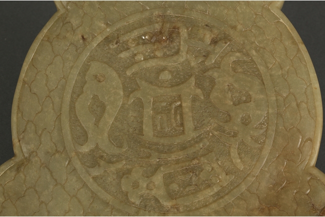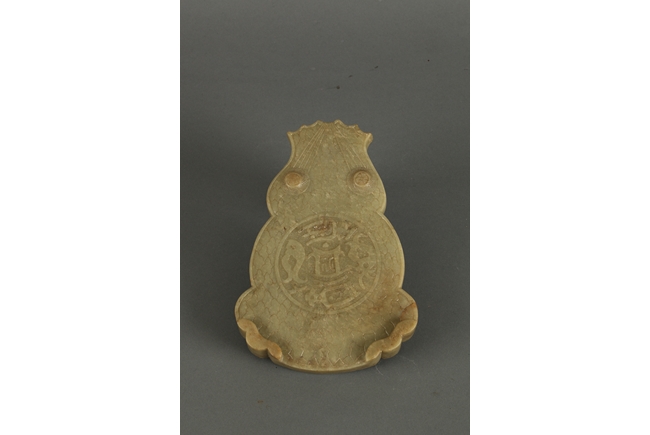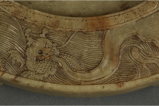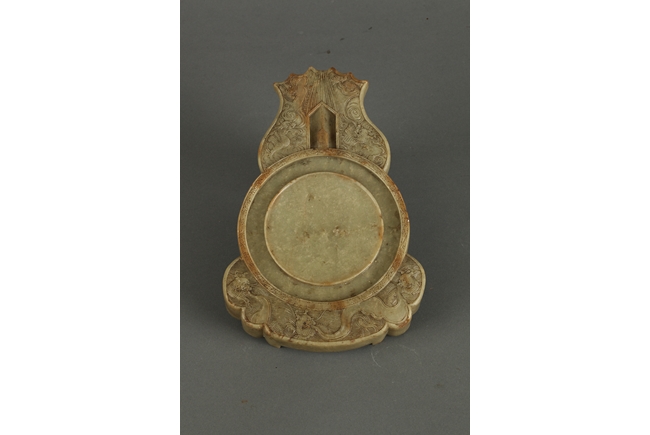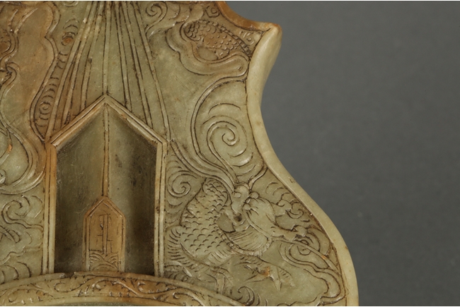 The convex top well carved five dragons in total, three in the bottom and two on top; a circle carved in the middle with washer shaped indentation around it; supported by four short legs; back side is carved with fine texture and a symbol in the middle.