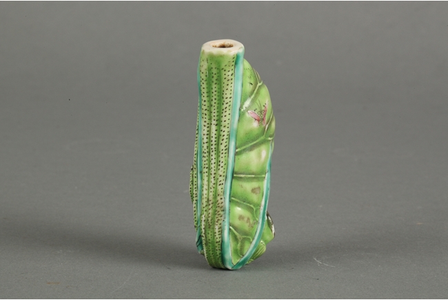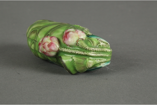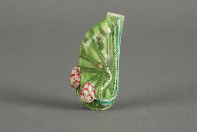 A green snuff bottle resembling the shape of a lotus petal, decorated with two separate lotus blossoms, extending gracefully towards the top. The smoothly polished bottle of light green features lotus veins on the body, along with a small cricket near the opening.