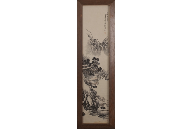 This painting depicts a beautiful landscape scene, with mountains, waterfall, people, trees, bridge, and a little cottage. Colophon, artist signature, and artist stamp on the top right.