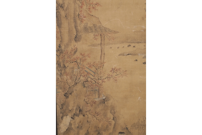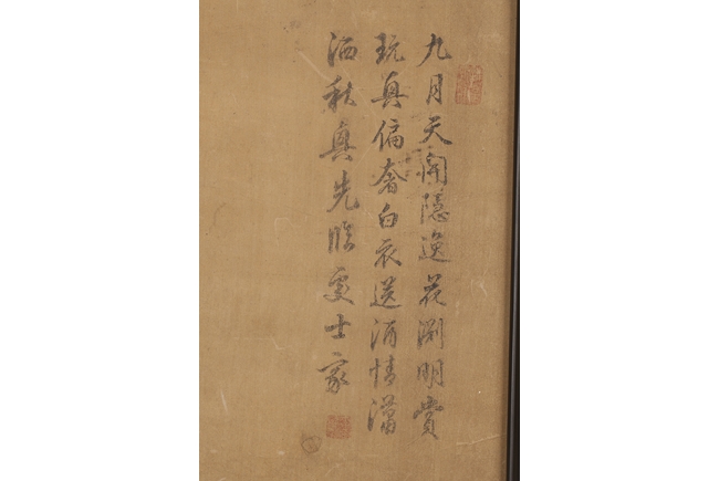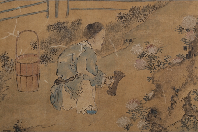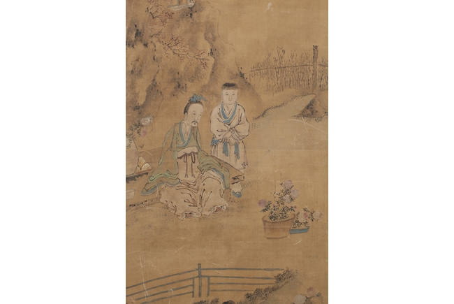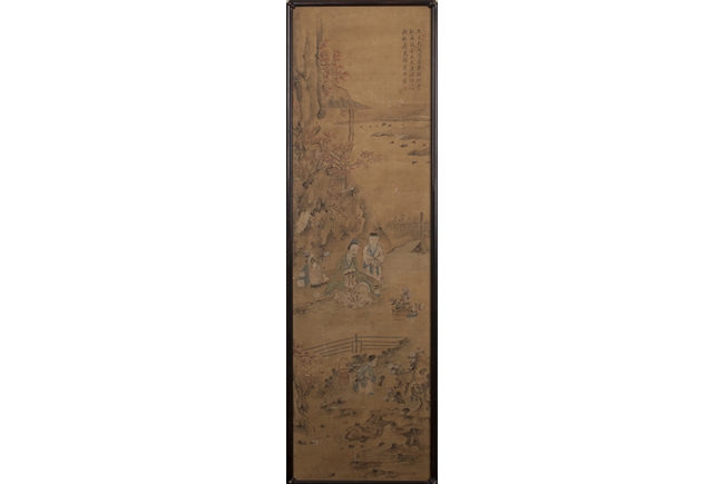This painting depicts a man and two child watching flower blossom outdoors during Autumn. A beautiful landscape sits in the background, and a Chinese poem on the top right corner, with artist seal mark.