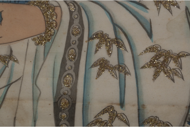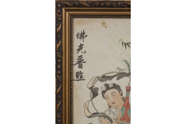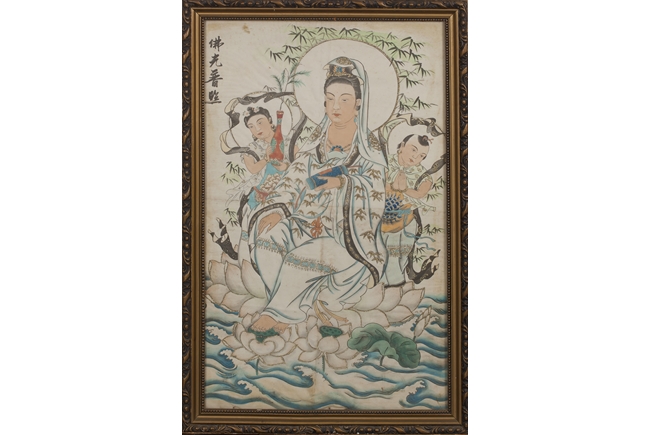A framed portrait of Guanyin sitting on a white lotus with two children standing behind. Gold colored glitter spread around the painting as decorations, with four Chinese words on top left corner.
