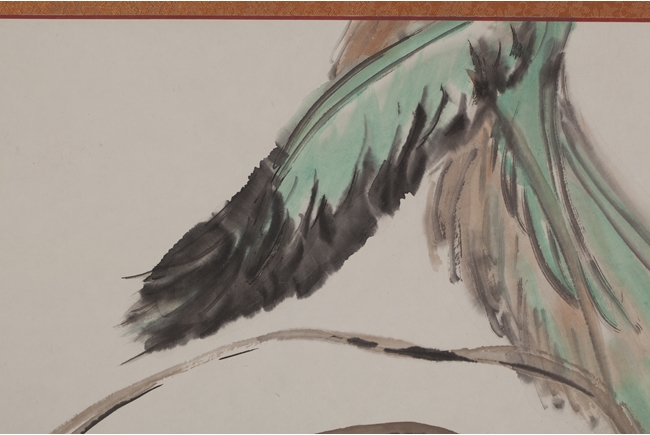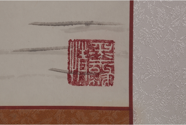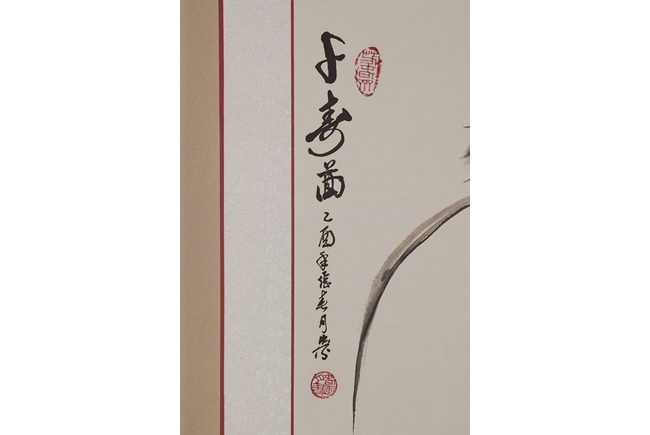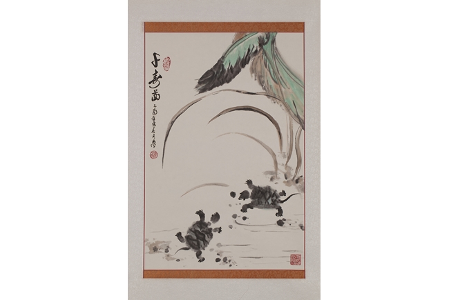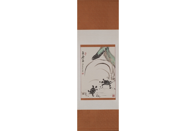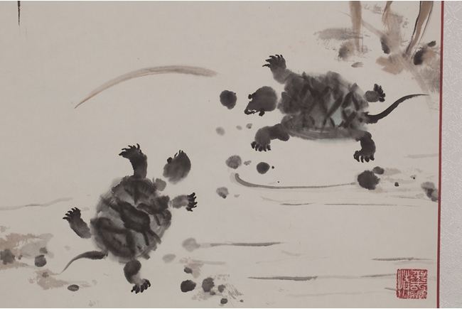 This gorgeous ink painting depicts two turtles lounging around underneath a giant leaf. Colophon, artist signature, and artist mark on the left side, and an artist mark on the bottom right corner.