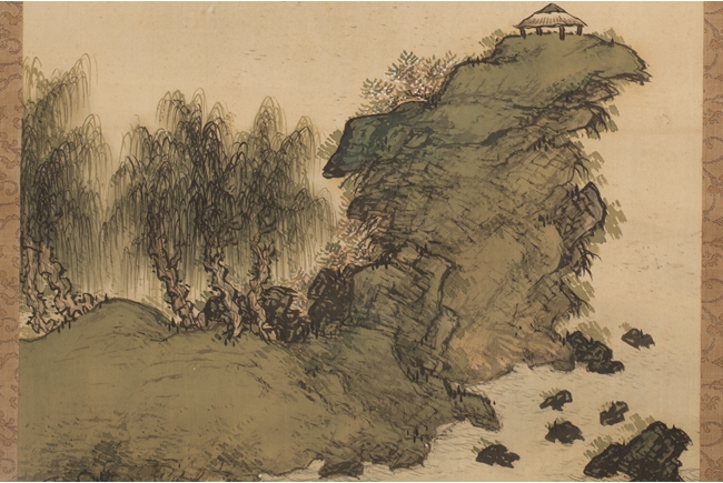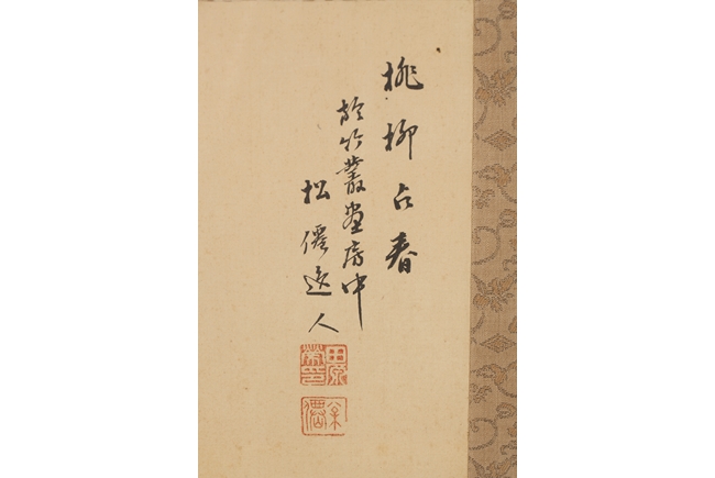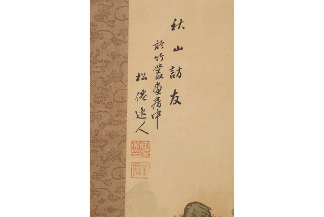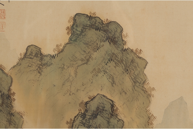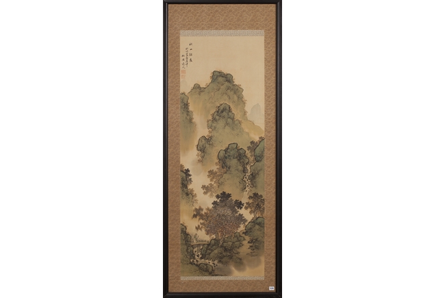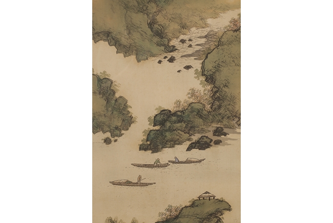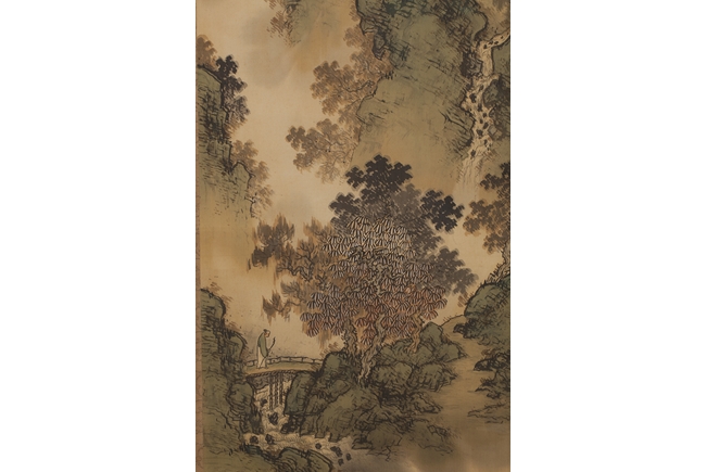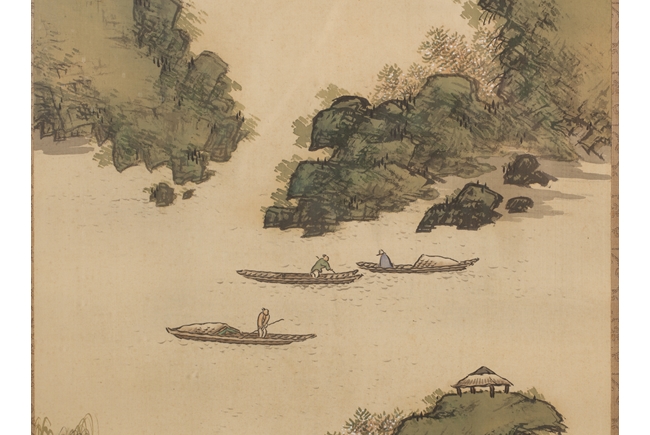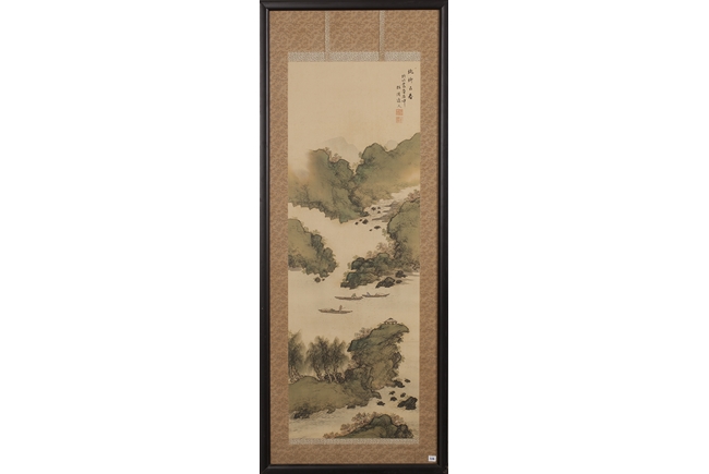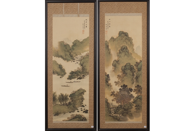 The pair of landscape paintings depict landscape scenes with calligraphy. One depicts large mountains with three small boats floating in the middle and the other with large mountains and a man walking across a bridge. Colophon, artist signature, and artist seal stamp on top.
