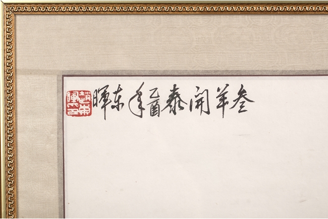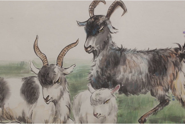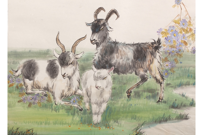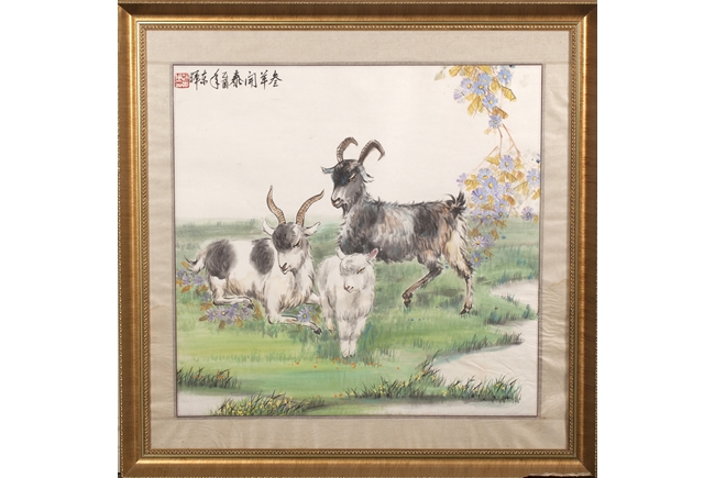 This ink painting depicts three sheep in an open field, two seated and one walking, symbolizing prosperity. Chinese characters are inked on top with an artist seal.