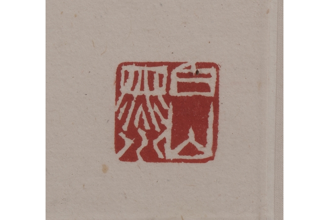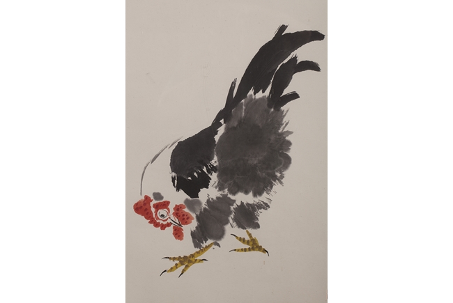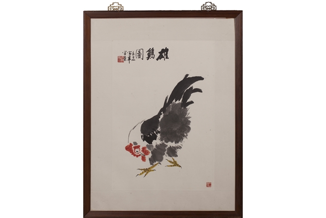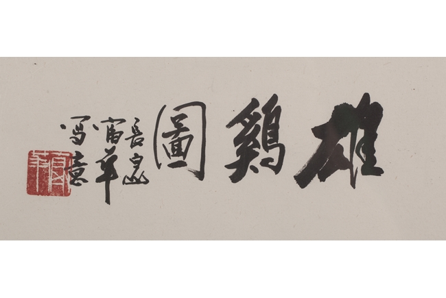 The painting depicts a rooster seeking food on the ground. Three Chinese characters title, artist signature, and mark on the top of painting. Small stamp seal also on the bottom right.