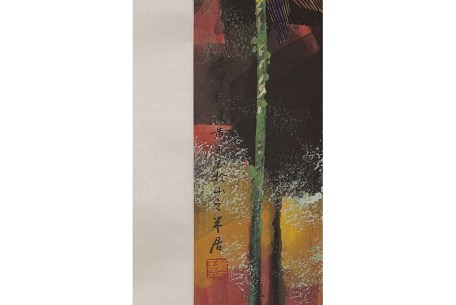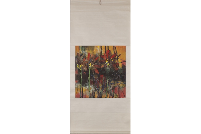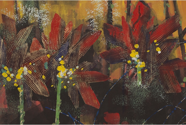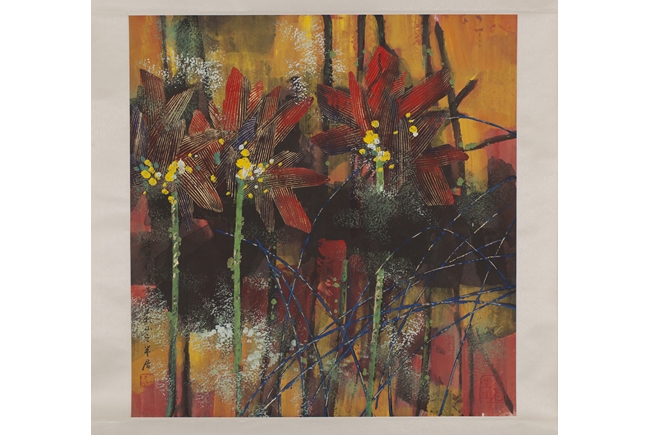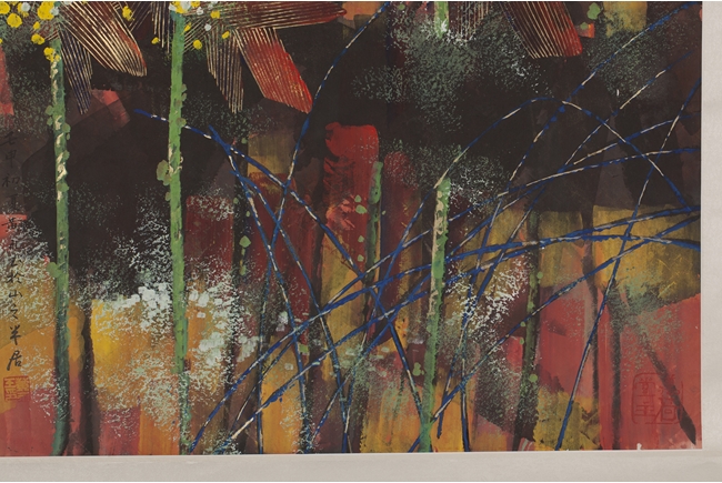 This sophisticated oil painting uses strong primary and tertiary colors to depict beautiful abstract flowers. Artist signature and seal mark on the bottom left corner, and another seal mark on the bottom right corner.